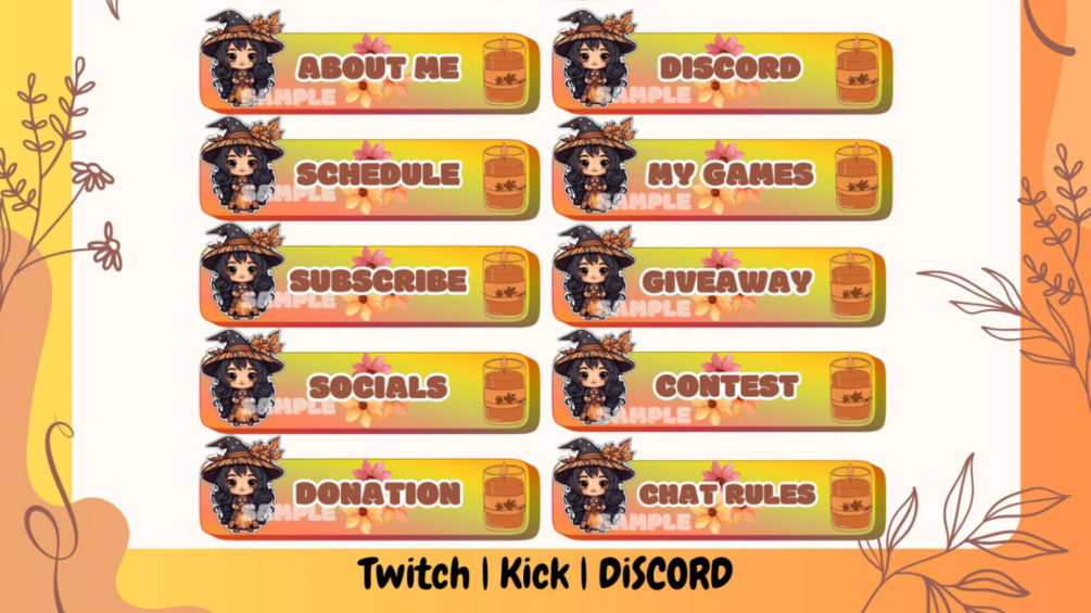 Perfect for creating a cute, trendy atmosphere with a sprinkle of autumn magic, these panels are ideal for anyone looking to bring those cozy, witchy vibes to life! ๐๐ Whether you're embracing spooky season or just the beauty of fall, these designs will make your stream or Discord feel as enchanting as a crisp autumn evening. ๐๐