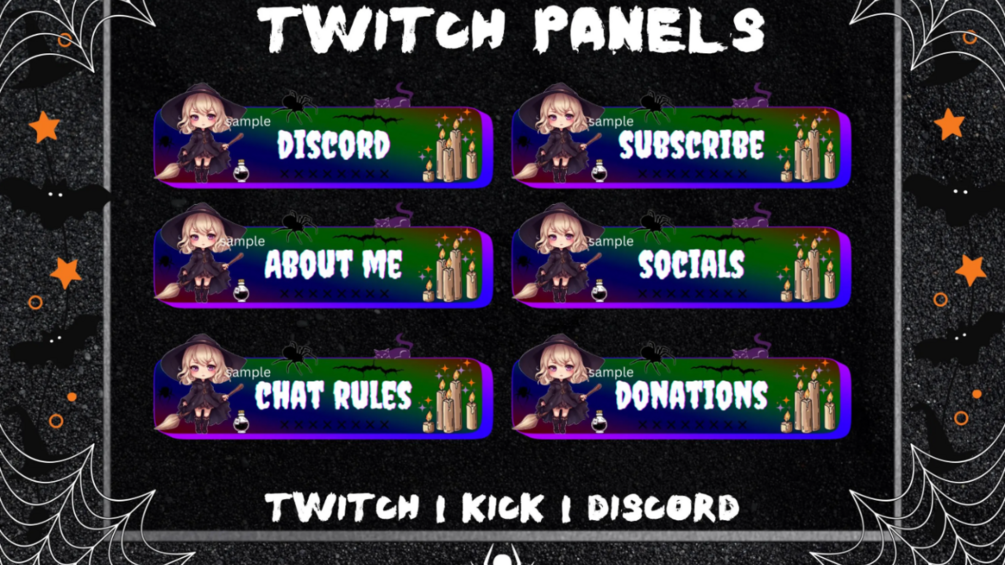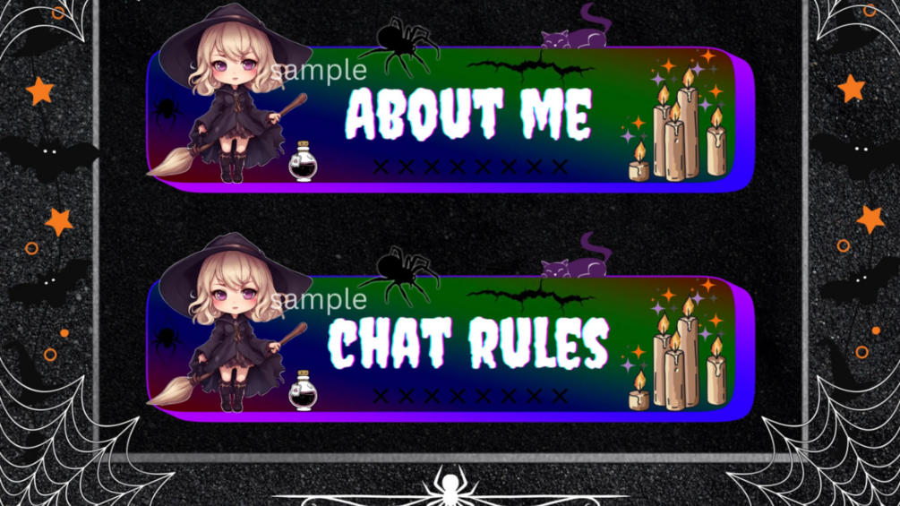 Add a touch of magic and mystery to your channel with these 10 adorable and spooky panels! Featuring a cute witch in a black dress holding her sparkling broomstick, potion bottles bubbling away, and flickering candles to set the mood, these panels will bring the perfect blend of charm and chill to your stream. 🧙‍♀️✨