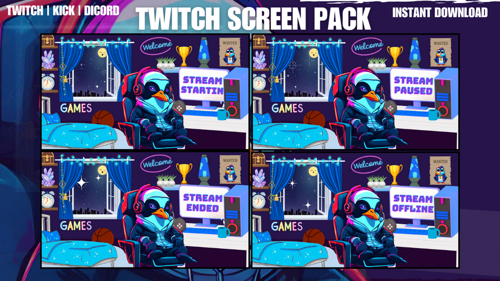 Level up your stream with this Penguin Power Overlay Pack! Featuring a cool gamer penguin with LED signs, quirky trinkets, and a hilarious “Wanted” sign for another penguin (trust me, there’s some serious beef there 🐧👀). The cozy bedroom setting has an epic view of the night sky from the window, plus tons of lights to make your stream pop like never before.